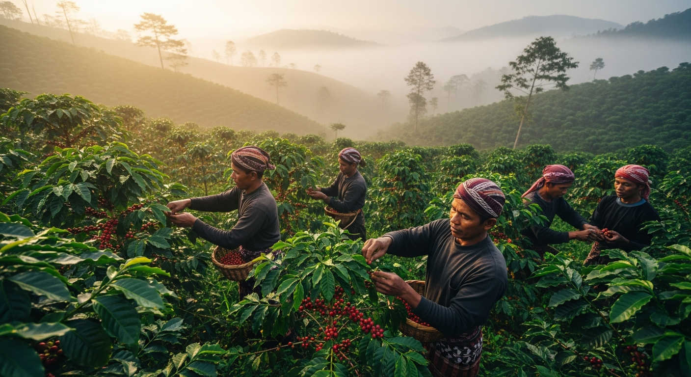 Our journey begins in the volcanic soils of the Indonesian archipelago. We don’t just source beans; we build relationships. By working directly with local farming cooperatives, we ensure fair wages and sustainable practices that preserve the land for generations to come.